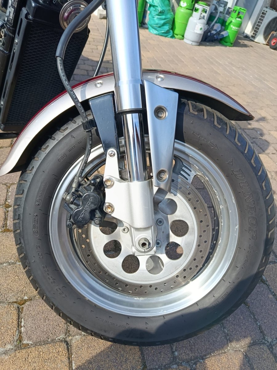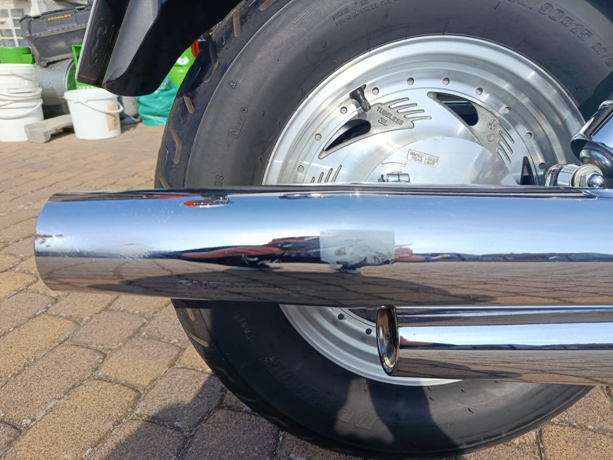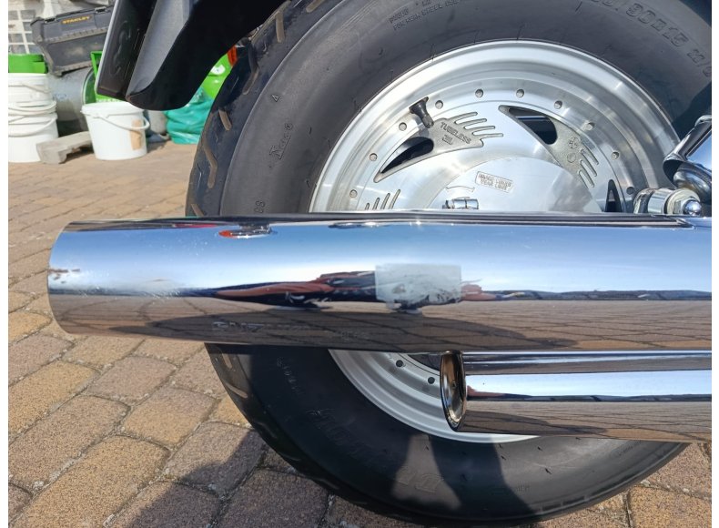 Motocykl ma widoczne ślady zarysowań z prawej strony (delikatne otarcie),